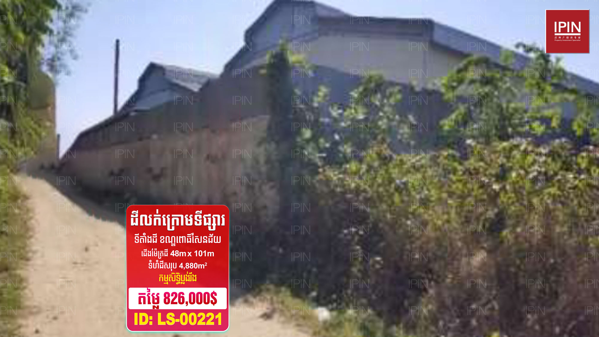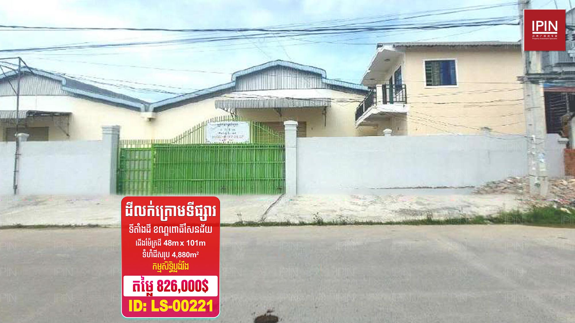 ដីមានទំហំទទឹងស្មើនឹង48ម៉ែត្រ បណ្តោយស្មើនឹង101ម៉ែត្រ និងមានទំហំសរុប 4,880ម៉ែត្រការរ៉េ មានកម្មសិទ្ធិប្លង់រឹងស្របច្បាប់100%។ ដីទីតាំងស្ថិត ភូមិត្រពាំងអណ្ដូង សង្កាត់ត្រពាំងក្រសាំង ខណ្ឌពោធិ៍សែនជ័យ រាជធានីភ្នំពេញ។