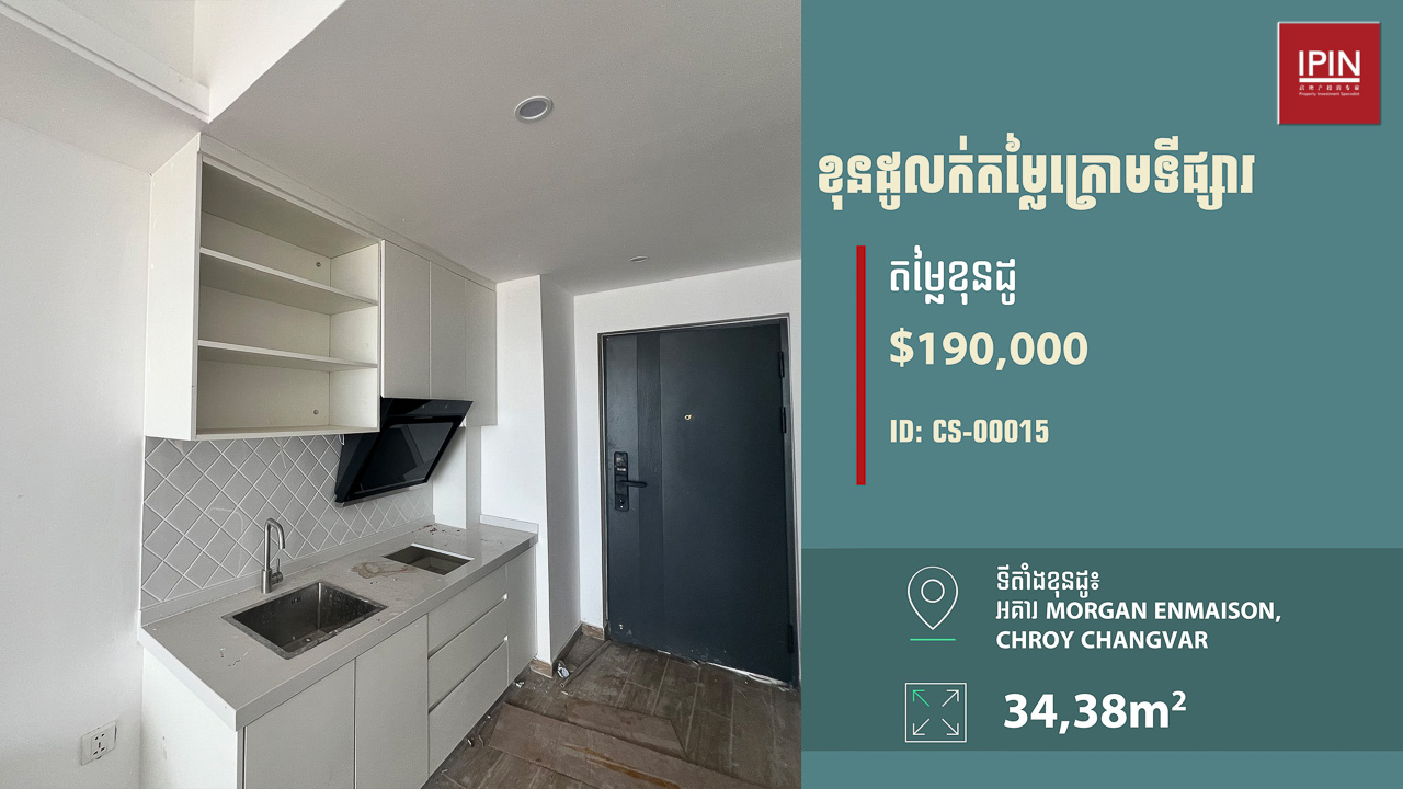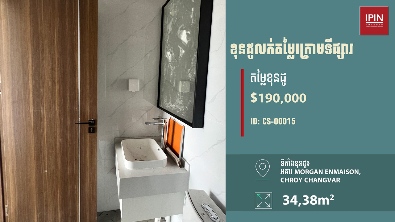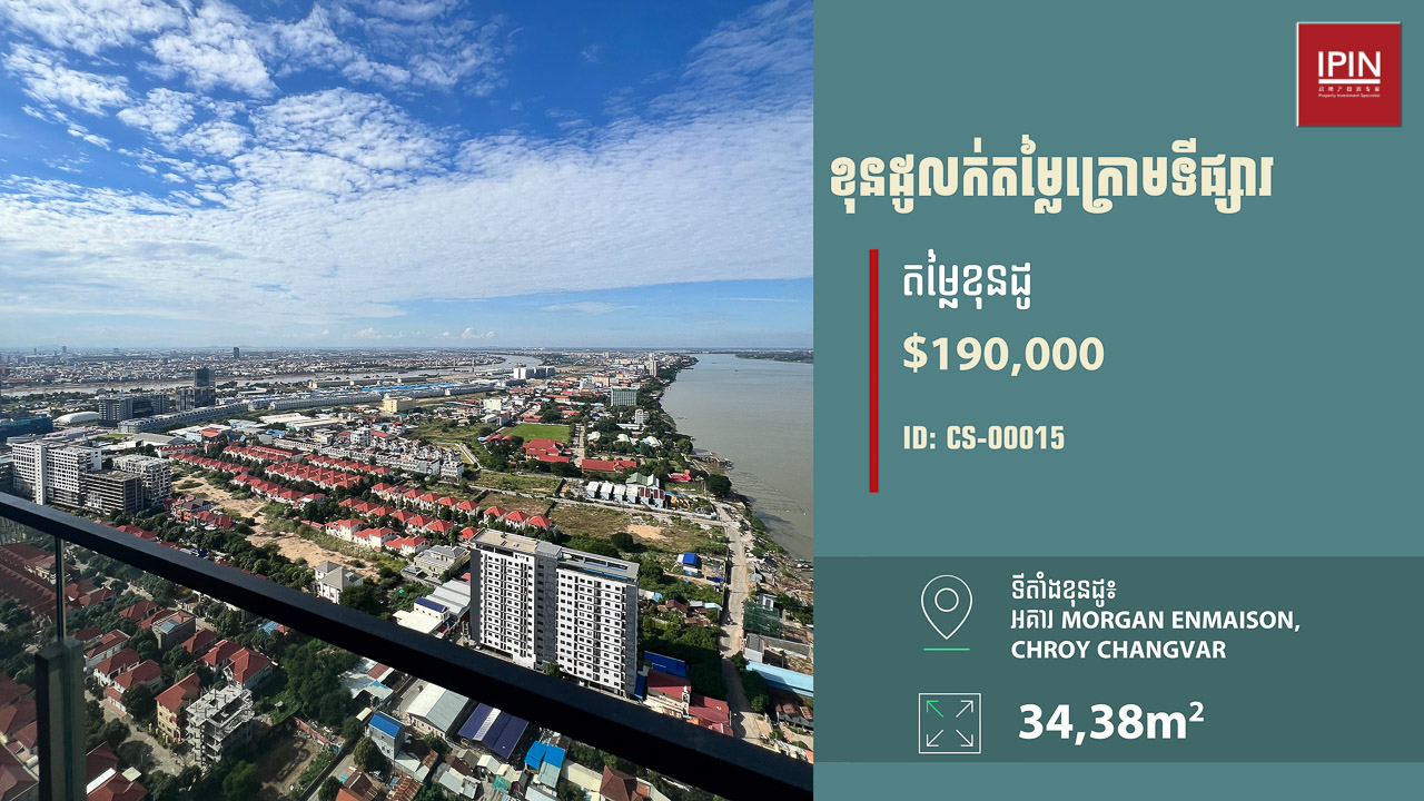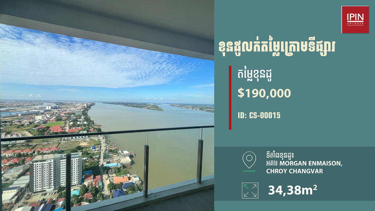 បន្ទប់នៅជាន់ទី39AF នៃអគារទី2 មានចំនួន2បន្ទប់ មានទំហំឯកជន 47.62 m² មានបន្ទប់គេង1 បន្ទប់ទឹក1 បន្ទប់ទទួលភ្ញៀវ1 ផ្ទះបាយ1 និងវេរ៉ង់ដាធំទូលាយ1​ និងបន្ទប់មួយទៀតមានទំហំឯកជន46.90 m2 មានបន្ទប់គេង1 បន្ទប់ទឹក1 បន្ទប់ទទួលភ្ញៀវ1 ផ្ទះបាយ1 និងវេរ៉ង់ដាធំទូលាយ1។ ស្ថិតក្នុងគម្រោង Morgan EnMaison ផ្លូវមេគង្គ ភូមិលេខ3 សង្កាត់ជ្រោយចង្វារ ខណ្ឌជ្រោយចង្វារ រាជធានីភ្នំពេញ។ បន្ទប់មានទេសភាពបែរទៅទិសខាងជើង អាចមើលទេសភាពទីក្រុង ភាគខាងជើង និងខាងលិចបាន ព្រមទាំងអាចមើលឃើញកោះដាច់ កោះឧកញ្ញាតី យូនីតមានកម្មសិទ្ធប្លង់ទន់។