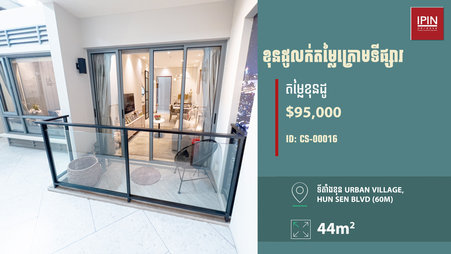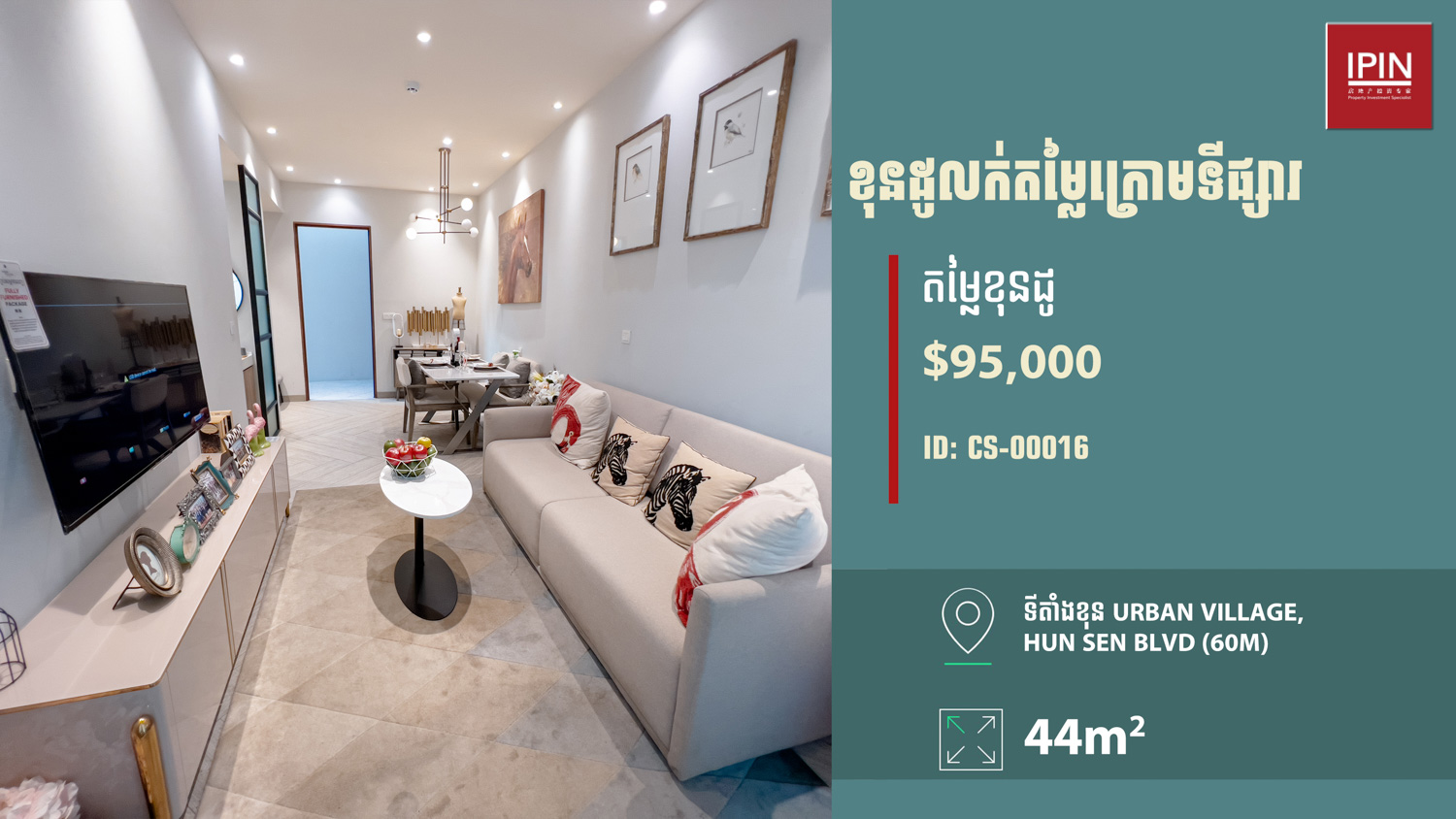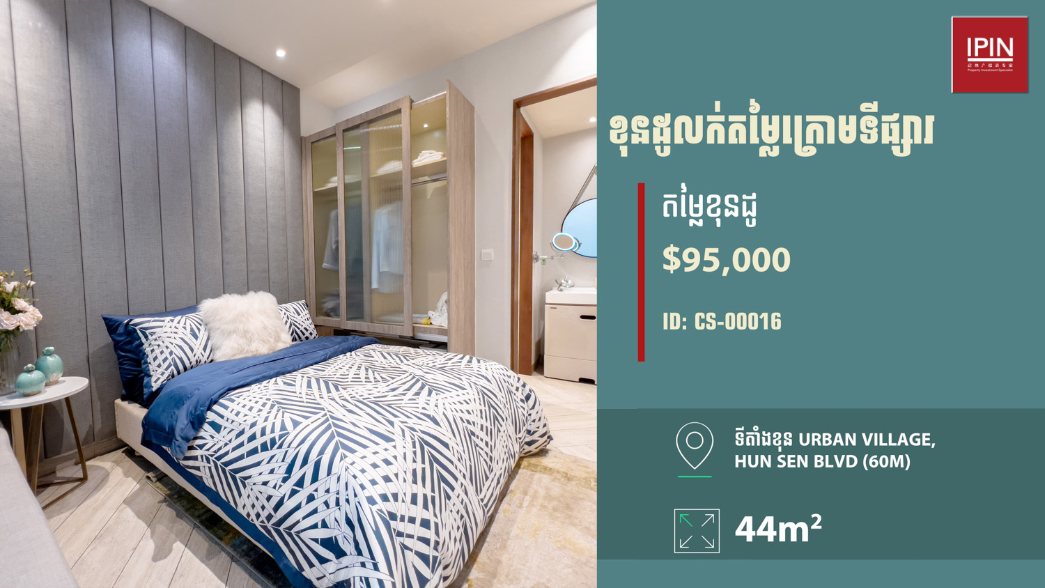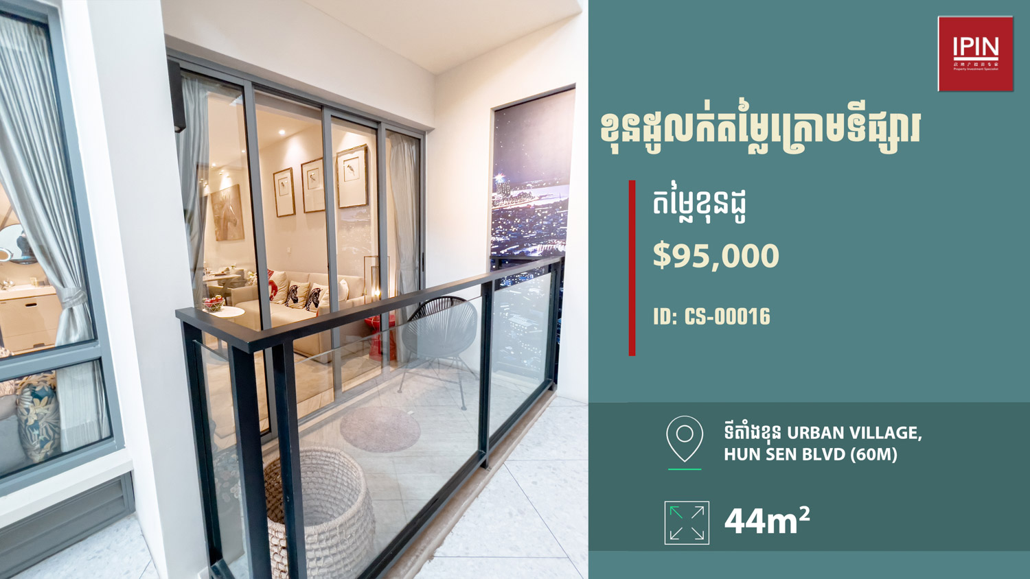 យូនីតនៅជាន់ទី19 បន្ទប់មានទំហំ 56ម៉ែត្រការ៉េ មានបន្ទប់គេង1 បន្ទប់ទឹក1 កម្មសិទ្ធិប្លង់រឹង ទេសភាពបែរទៅច្បារអំពៅនិងទន្លេបាសាក់។ មានទតាំងស្ថិតនៅក្នុងគម្រោង Urban Village ជាប់នឹងមហាវិថីសមេ្តចតេជោហ៊ុនសែន (60ម៉ែត្រ) ស្ថិតនៅភាគខាងត្បូងនៃទីក្រុងភ្នំពេញដែលកំពុងប្រែក្លាយជាទីក្រុងថ្មីស្របតាមផែនការអភិវឌ្ឍន៍របស់រាជរដ្ឋាភិបាលកម្ពុជា។