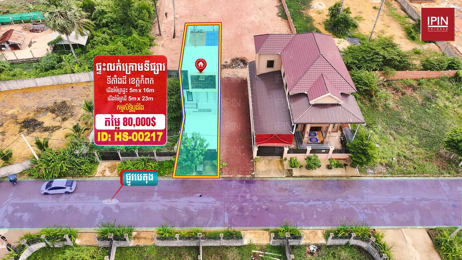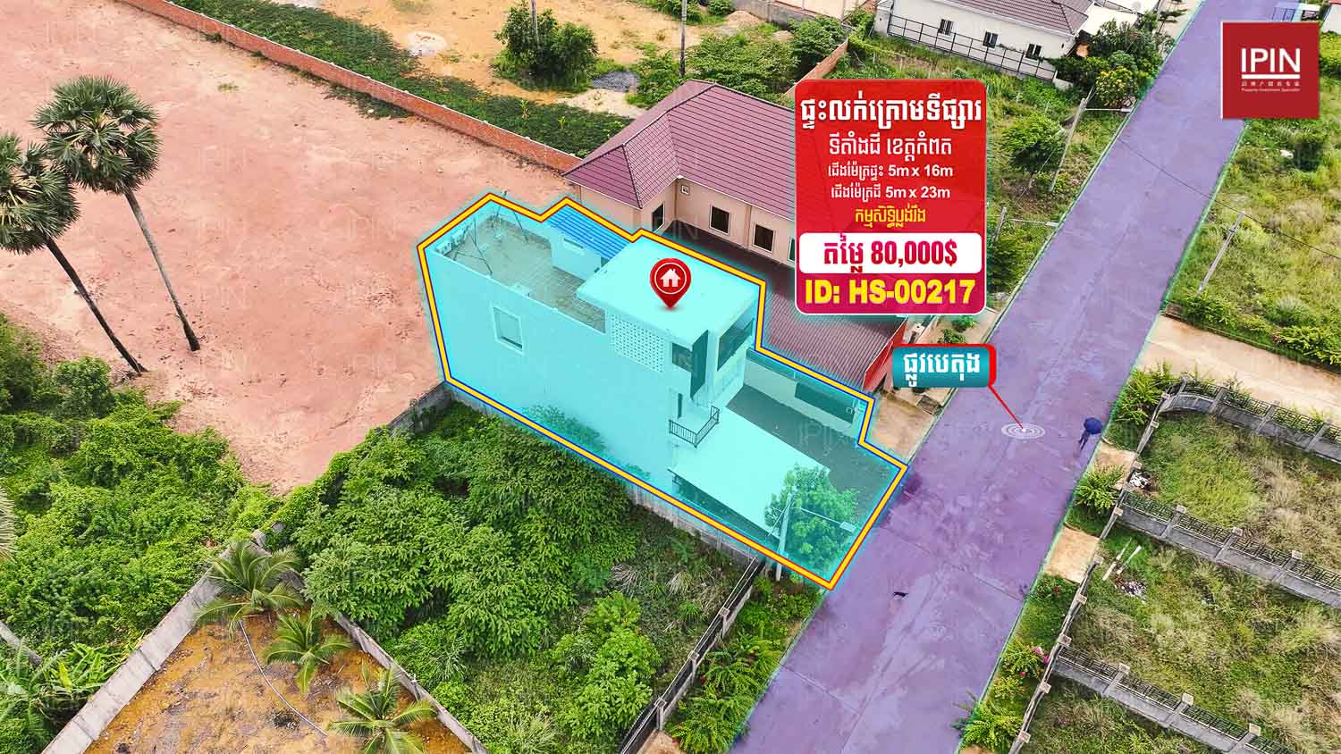 ទំហំដីទទឹងស្មើនឹង 5ម៉ែត្រ បណ្តោយស្មើនឹង 23ម៉ែត្រ និងផ្ទះមានទំហំទទឹងស្មើនឹង 5ម៉ែត្រ បណ្តោយស្មើនឹង 16ម៉ែត្រ សល់មុខផ្ទះ 6ម៉ែត្រ ផ្ទះមានបន្ទប់គេង3 បន្ទប់ទឹក4 មានផ្ទះបាយ1 មានកម្មសិទ្ធិប្លង់រឹងស្របច្បាប់100%។