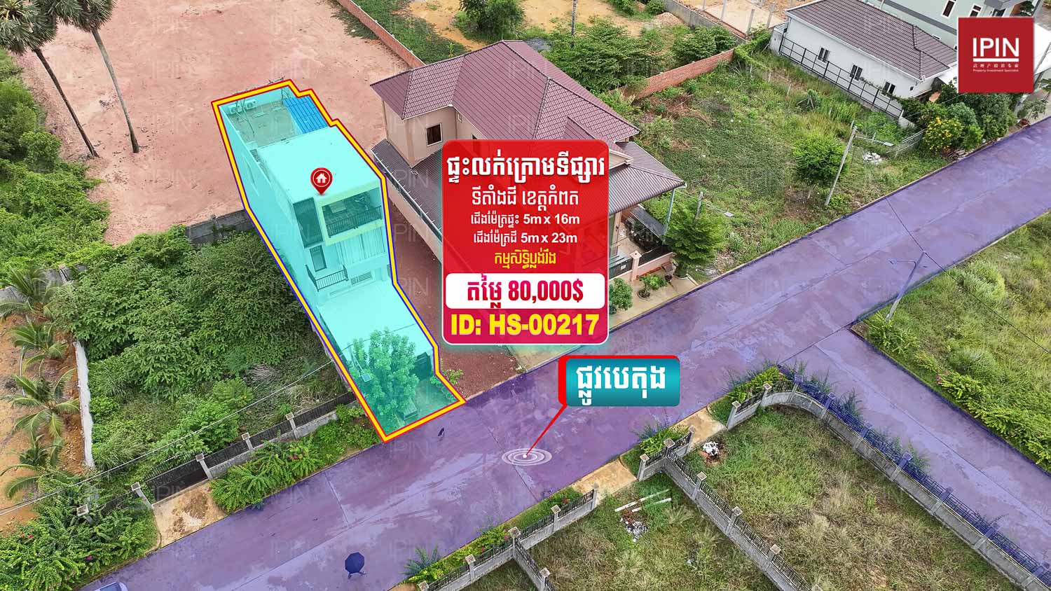 ទំហំដីទទឹងស្មើនឹង 5ម៉ែត្រ បណ្តោយស្មើនឹង 23ម៉ែត្រ និងផ្ទះមានទំហំទទឹងស្មើនឹង 5ម៉ែត្រ បណ្តោយស្មើនឹង 16ម៉ែត្រ សល់មុខផ្ទះ 6ម៉ែត្រ ផ្ទះមានបន្ទប់គេង3 បន្ទប់ទឹក4 មានផ្ទះបាយ1 មានកម្មសិទ្ធិប្លង់រឹងស្របច្បាប់100%។  ផ្ទះមានទីតាំងស្ថិតនៅភូមិស្វាយធំ សង្កាត់ក្រាំងអំពិល​ ក្រុងកំពត ខេត្តកំពត។ ធ្វើដំណើរពីទីរួមខ...