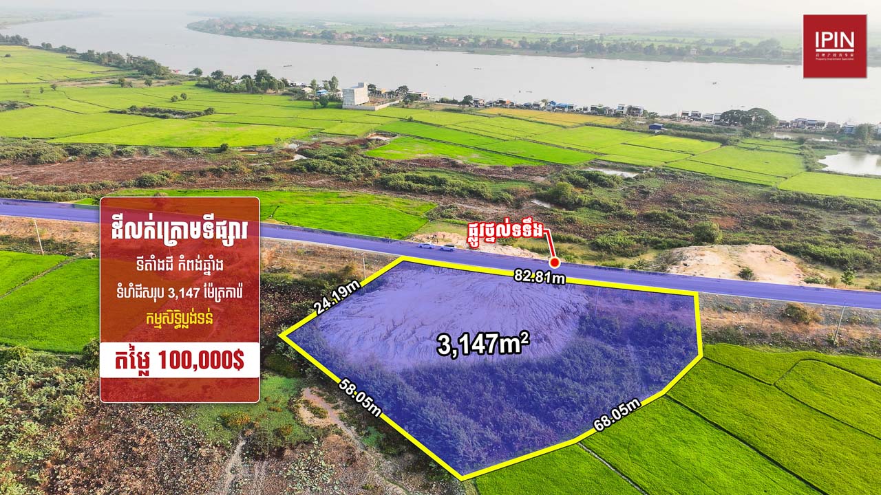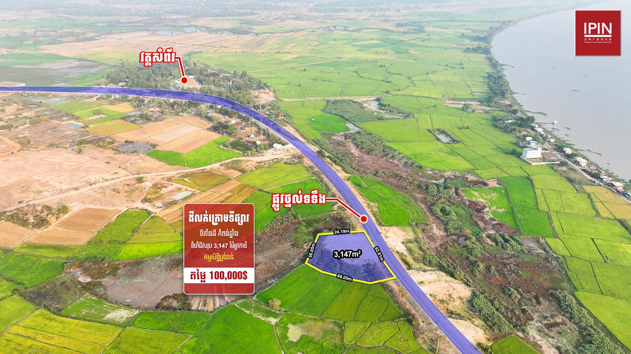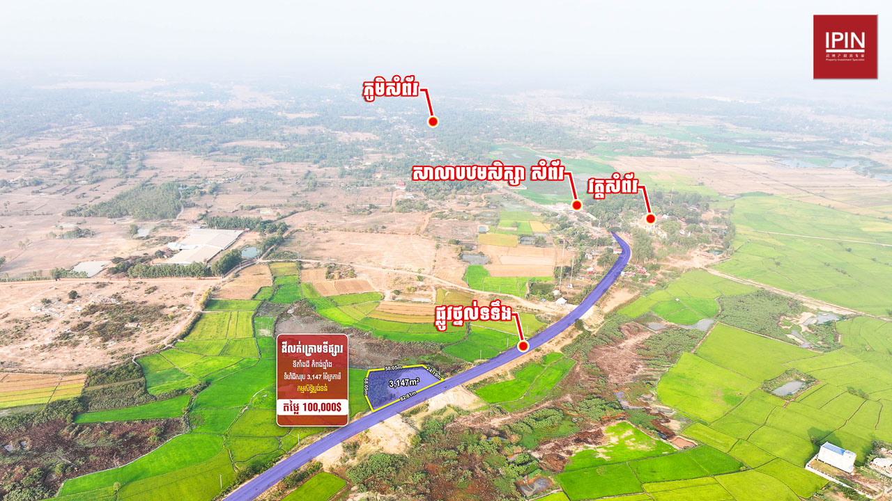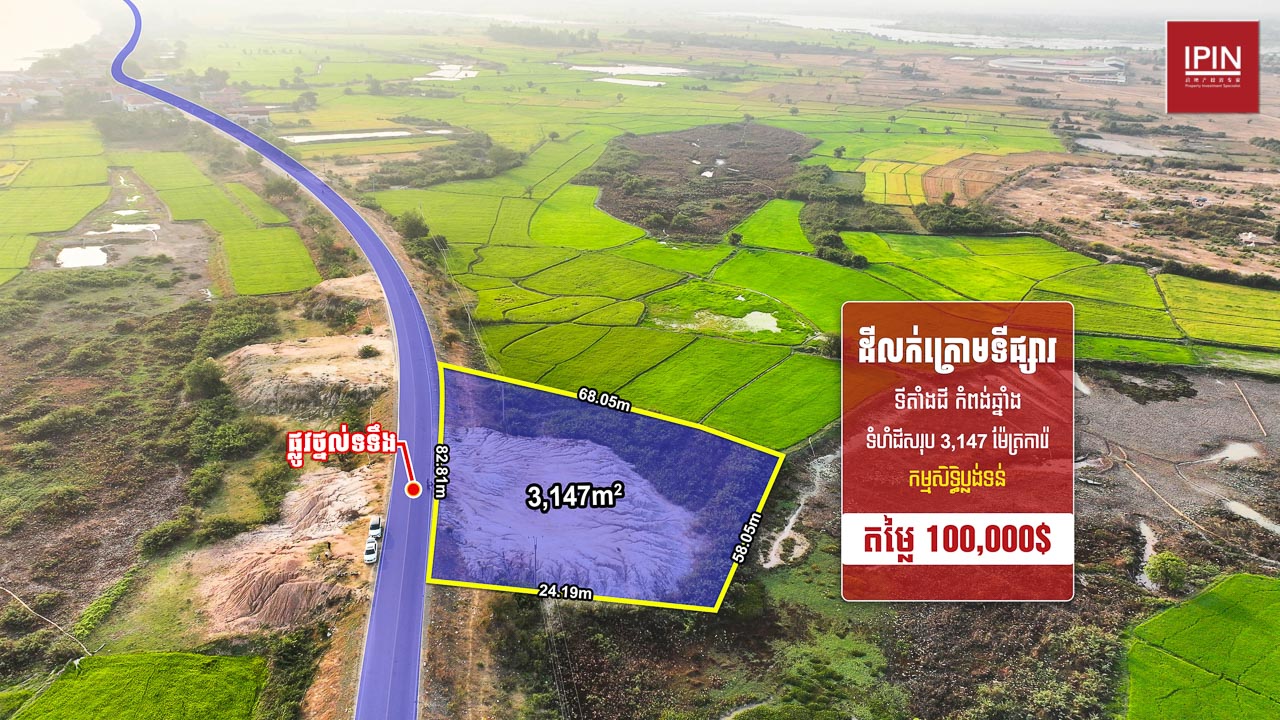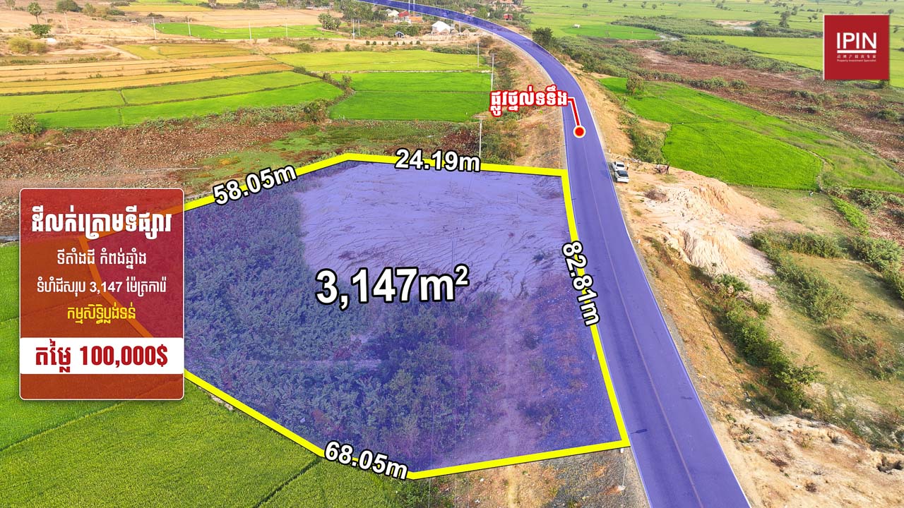 ដីមានទំហំសរុប 3,147m² ទទឹងស្មើនឹង 82m និងបណ្តោយ 24m មានកម្មសិទ្ធិប្លង់ទន់។ ដីមានទីតាំងស្ថិតនៅជិតផ្សារថ្នល់ទទឹង និងភូមិសំរោង ម្ចាស់ត្រូវការលក់បន្ទាន់តម្លៃក្រោមទីផ្សារ មានទីតាំងស្ថិតនៅ ភូមិសំព័រ ឃុំតាជេស ស្រុកកំពង់ត្រឡាច ខេត្តកំពង់ឆ្នាំង។ ដីជិតផ្លូវជាតិលេខ5  ចម្ងាយត្រឹមតែ5នាទីពីផ្សារថ្នល់ទទ...