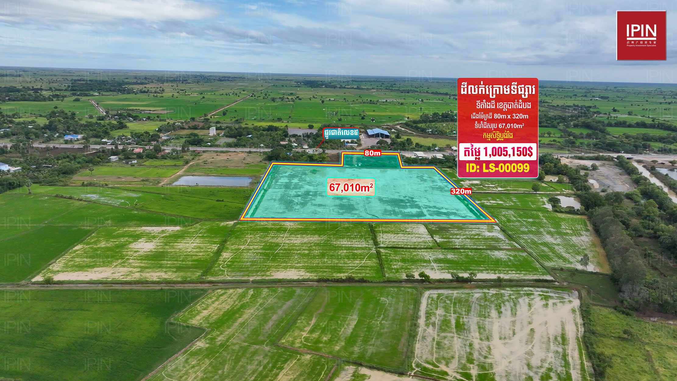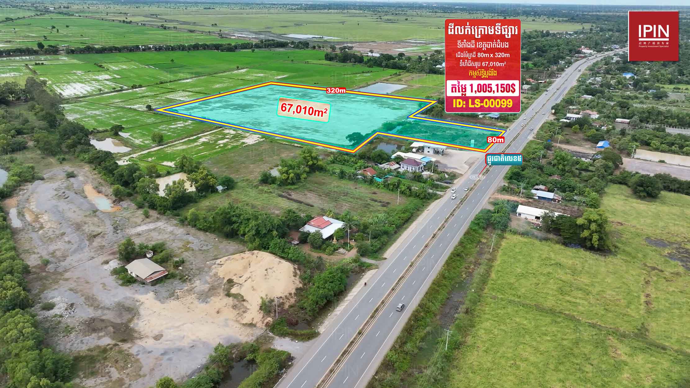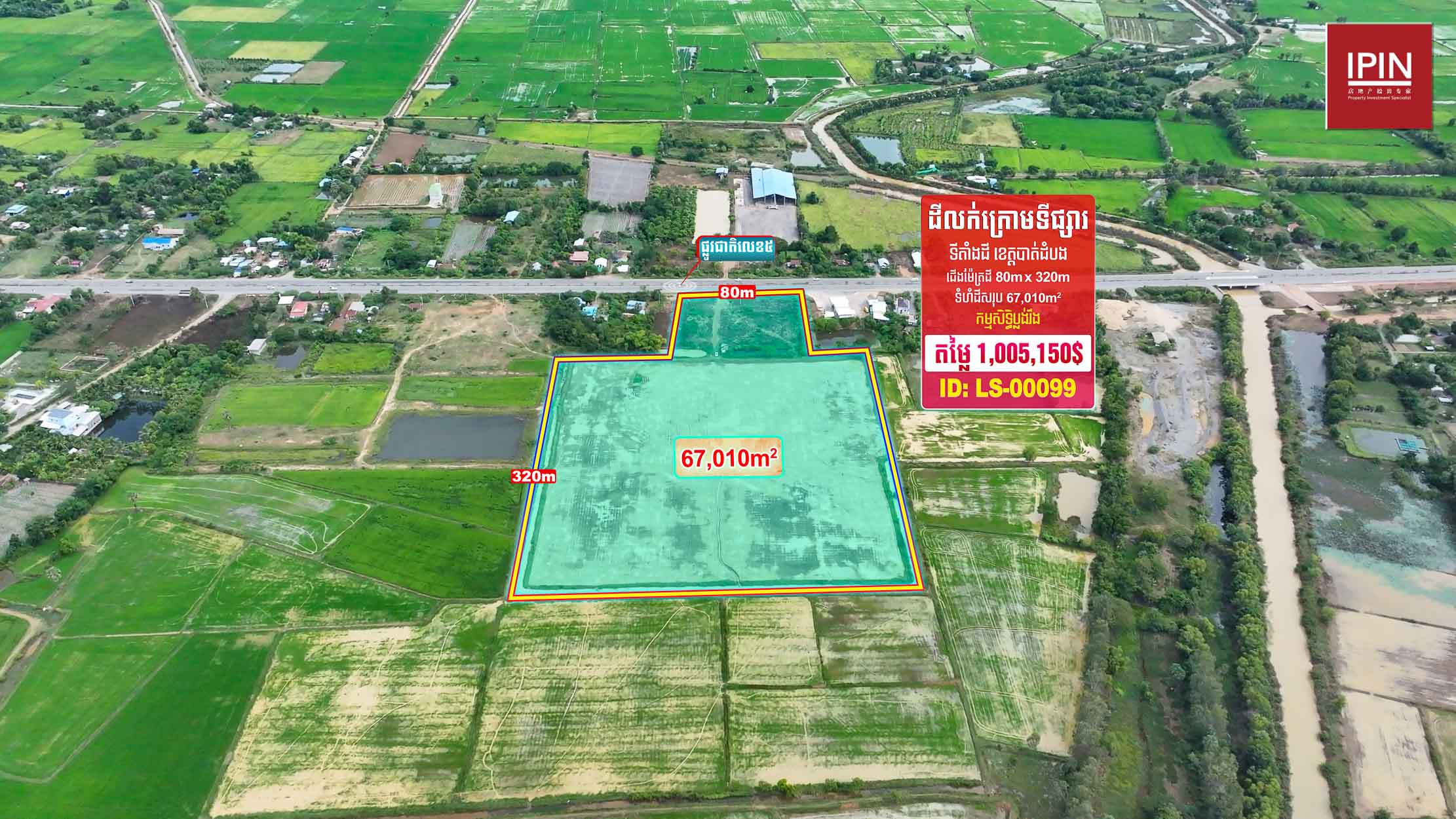 ដីមានទំហំទទឹងស្មើនឹង 80ម៉ែត្រ បណ្តោយស្មើនឹង 320ម៉ែត្រ និងទំហំសរុប 67,010ម៉ែត្រការ៉េ មានកម្មសិទ្ធិប្លង់រឹង។ មានទីតាំងស្ថិតនៅភូមិស្រះកែវ ឃុំកំពង់ព្រះ ស្រុកសង្កែ ខេត្តបាត់ដំបង។ ដីធំទូលាយជាប់នឹងផ្លូវលេខ5 ក្បែរសាលាបឋមសិក្សាស្រះកែវ និងភូមិស្រះកែវ ជិតនឹងភូមិក្បាលថ្នល់ដែលអាចសាងសង់ជាលំនៅដ្ឋាន បើកភោជនីយដ្ឋាន បើកជាការ៉ាស់សាំង ឬធ្វើជារមណីយដ្ឋានក៏បាន។
