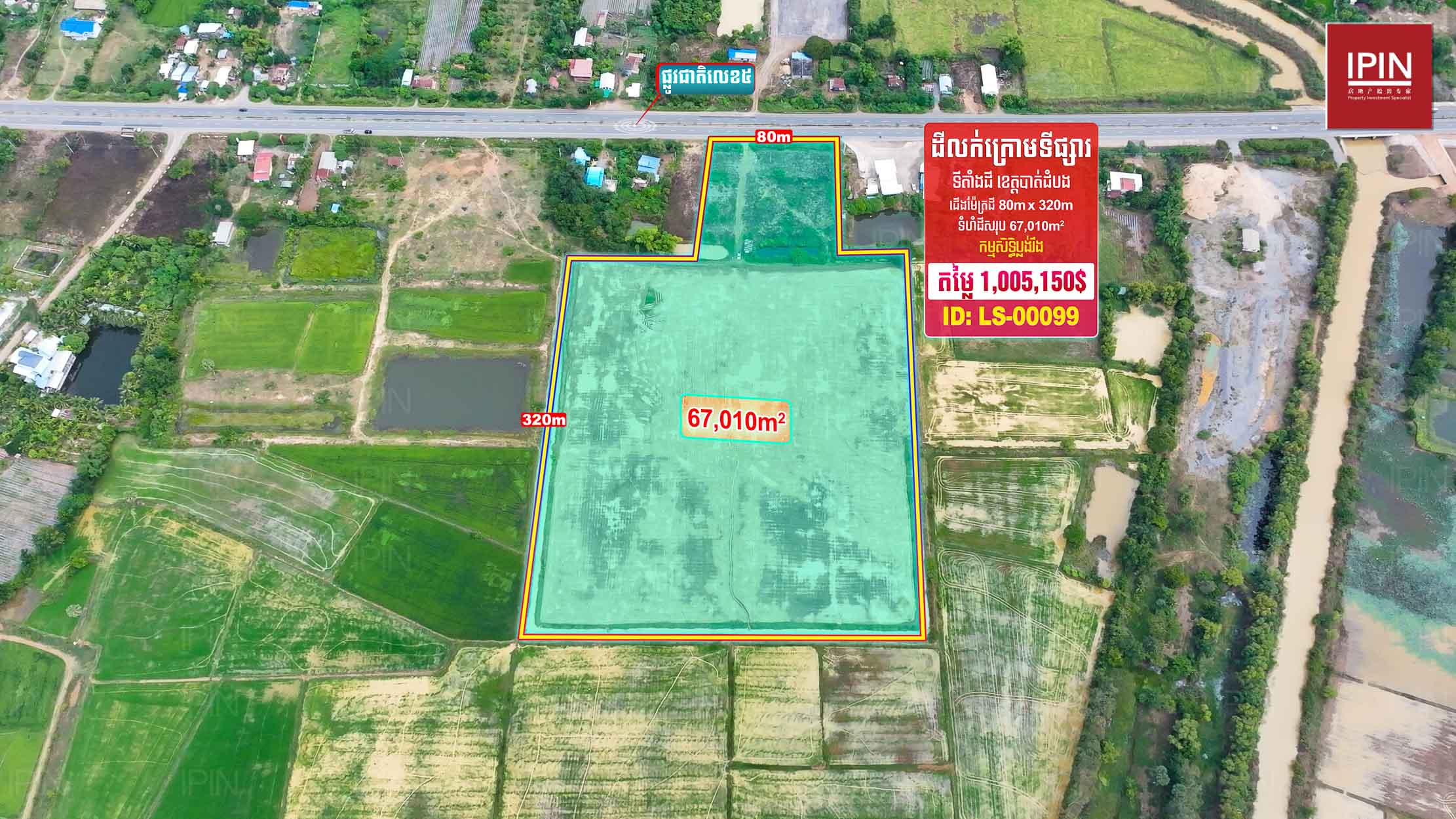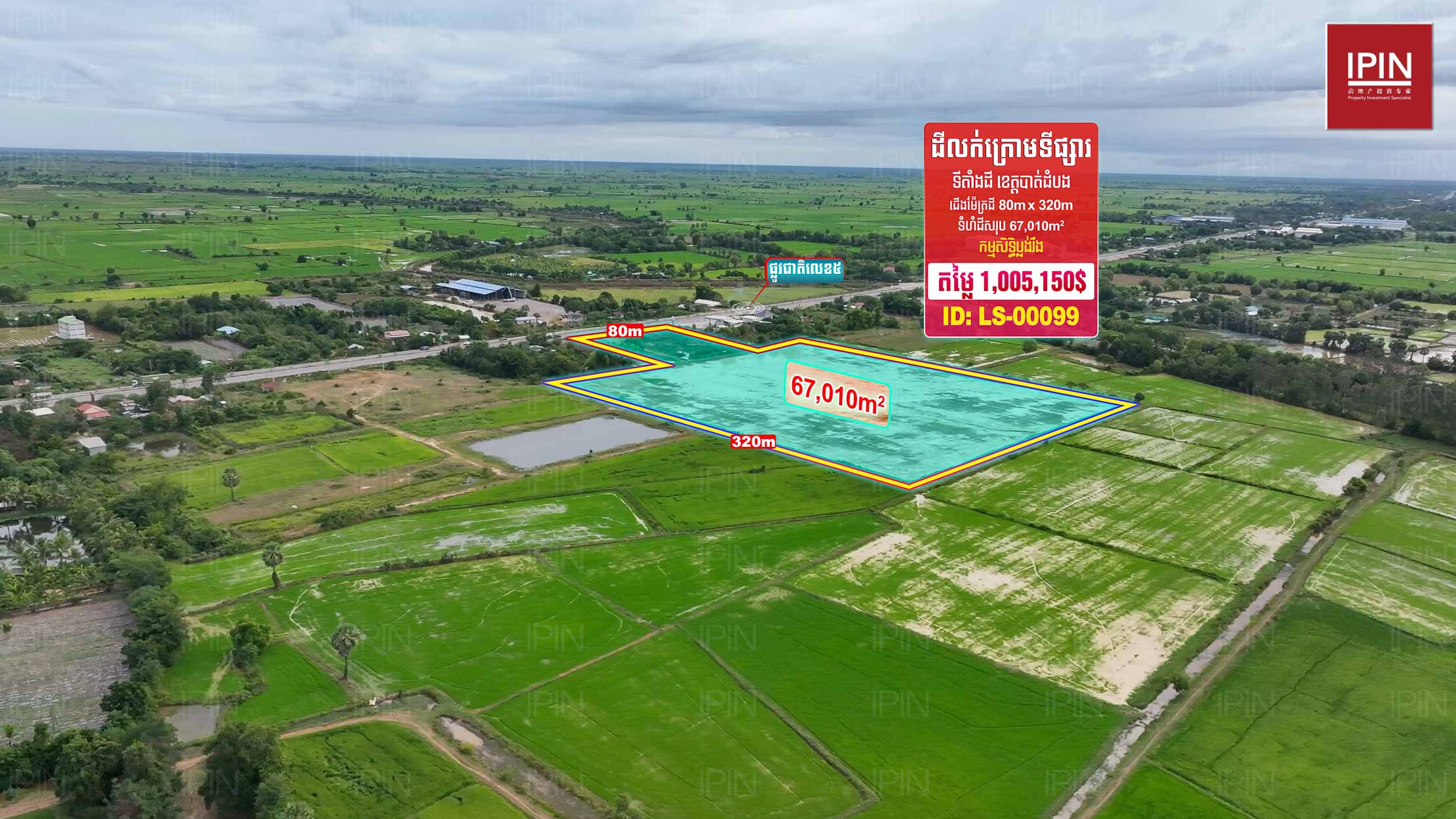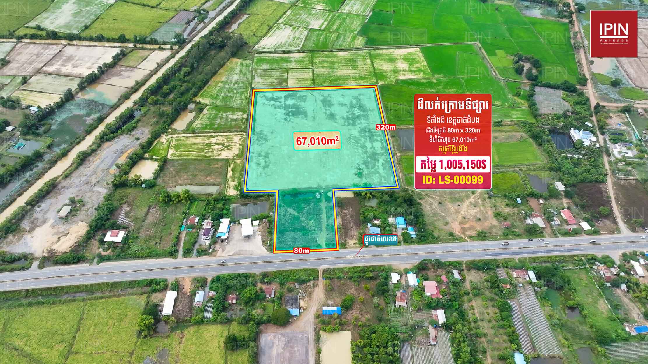 ដីមានទំហំទទឹងស្មើនឹង 80ម៉ែត្រ បណ្តោយស្មើនឹង 320ម៉ែត្រ និងទំហំសរុប 67,010ម៉ែត្រការ៉េ មានកម្មសិទ្ធិប្លង់រឹង។ មានទីតាំងស្ថិតនៅភូមិស្រះកែវ ឃុំកំពង់ព្រះ ស្រុកសង្កែ ខេត្តបាត់ដំបង។ ដីធំទូលាយជាប់នឹងផ្លូវលេខ5 ក្បែរសាលាបឋមសិក្សាស្រះកែវ និងភូមិស្រះកែវ ជិតនឹងភូមិក្បាលថ្នល់ដែលអាចសាងសង់ជាលំនៅដ្ឋាន បើកភោជនីយដ្ឋាន បើកជាការ៉ាស់សាំង ឬធ្វើជារមណីយដ្ឋានក៏បាន។