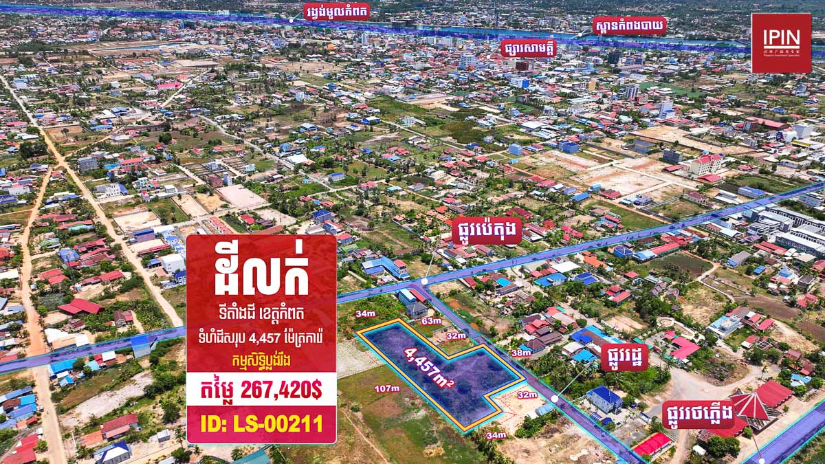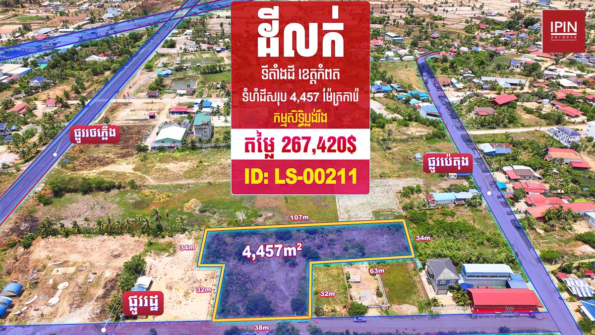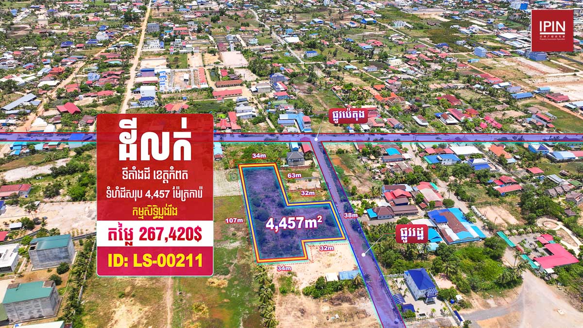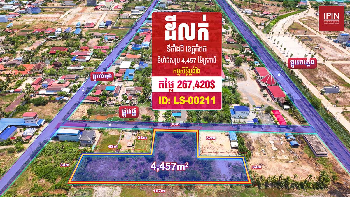 ដីមានទំហំទទឹងស្មើនឹង38m បណ្តោយស្មើនឹង66m និងមានទំហំសរុប 4,457m² មានកម្មសិទ្ធិប្លង់រឹងស្របច្បាប់100% ។ ដីជាប់ផ្លូវរដ្ឋ ចុះពីផ្លូវជាតិលេខ3 ប្រហែល400m ម្ចាស់ត្រូវការលក់បន្ទាន់ ដីទីតាំងស្ថិតភូមិស្វាយធំ ឃុំក្រាំងអំពិល ក្រុងកំពត ខេត្តកំពត។