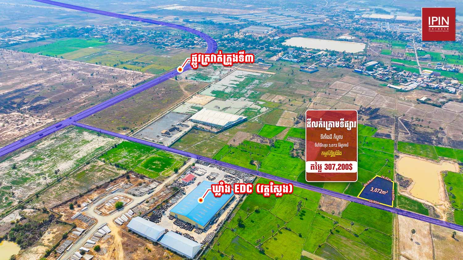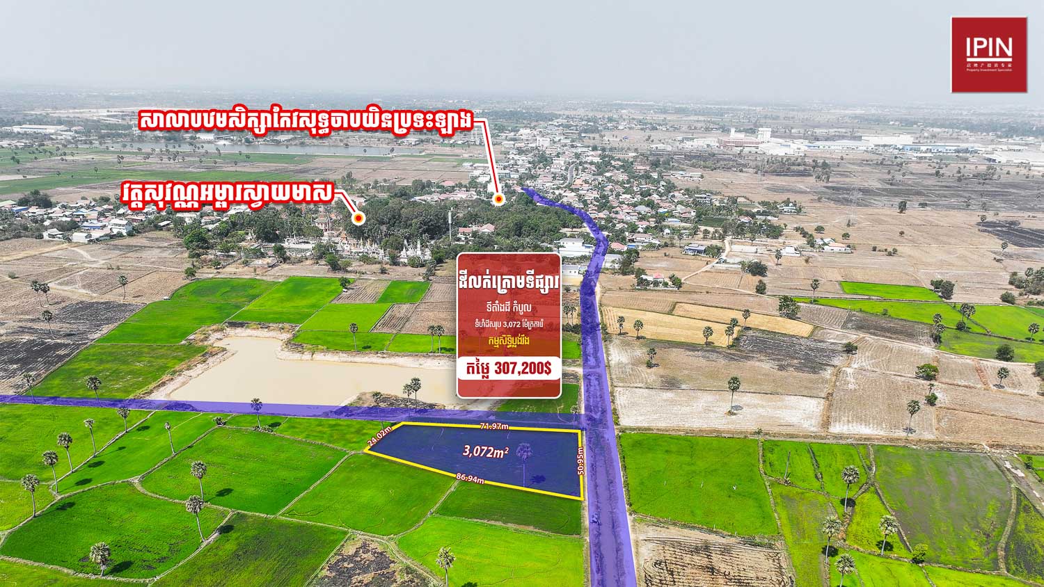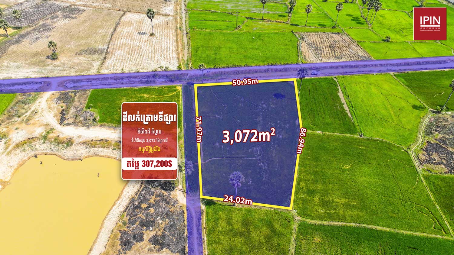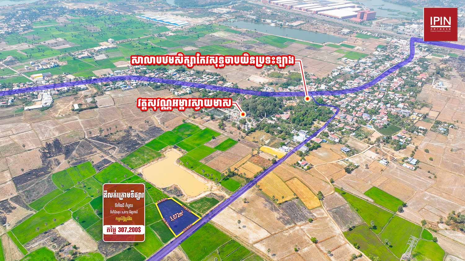 ដីមានទំហំសរុប 3,072m² ទទឹងស្មើនឹង 50.95m និងបណ្តោយ 86.94m មានកម្មសិទ្ធិប្លង់រឹង។ ដីមានទីតាំងស្ថិតនៅក្បែរផ្លូវក្រវាត់ក្រុងទី3 និងផ្លូវជាតិលេខ3 ជិតសាលាបឋមសិក្សាកែវសុទ្ធចាបយិនប្រទះឡាង និងវត្ដសុវណ្ណអម្ពារមាស ម្ចាស់ត្រូវការលក់បន្ទាន់តម្លៃក្រោមទីផ្សារ មានទីតាំងស្ថិតនៅ ភូមិភា សង្កាត់ប្រទះឡាង ខណ្ឌកំបូល រាជធានីភ្នំពេញ។