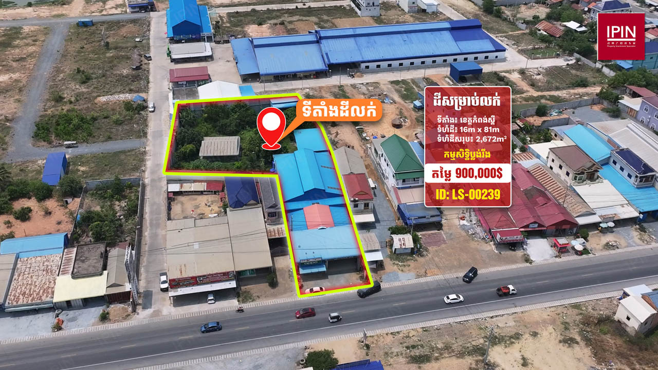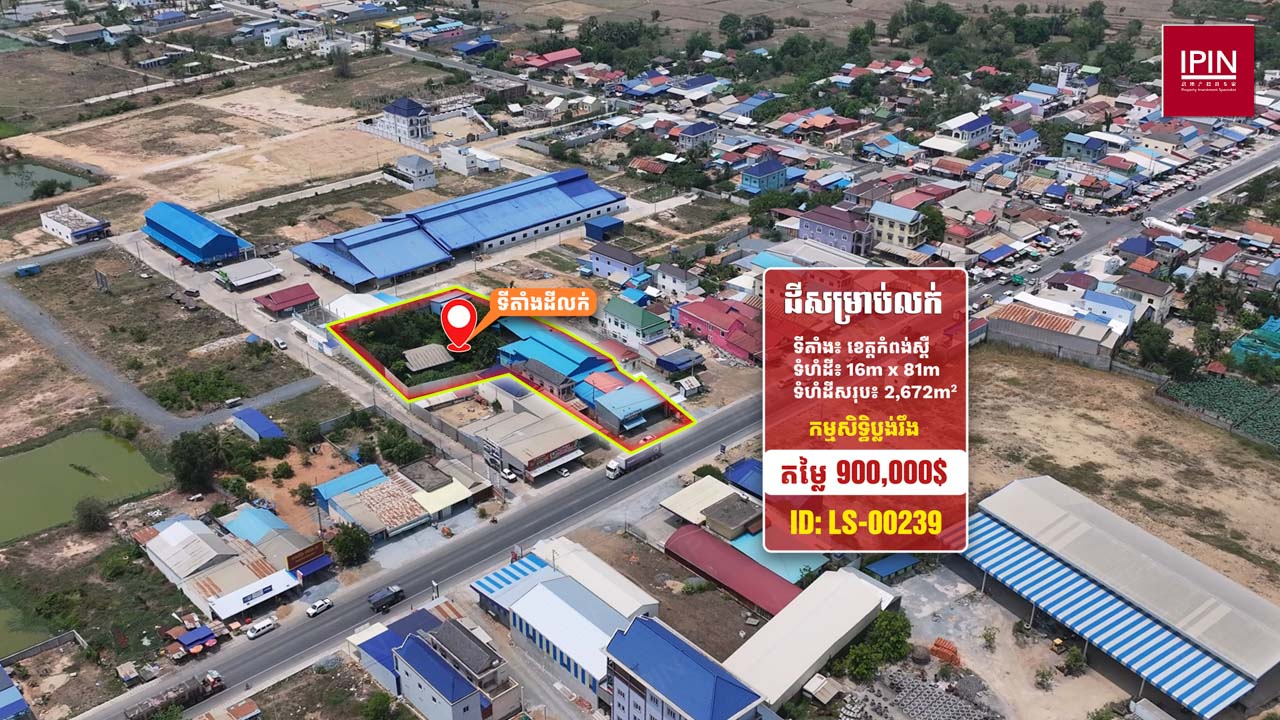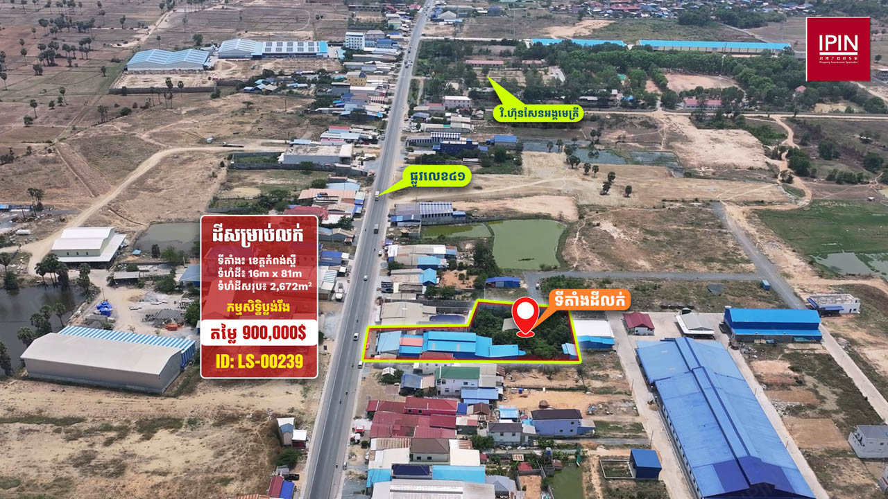 ដីមានទំហំទទឹងស្មើនឹង 16ម៉ែត្រ បណ្តោយស្មើនឹង 81ម៉ែត្រ និងទំហំសរុបស្មើនឹង 2,672ម៉ែត្រការ៉េ មានកម្មសិទ្ធិប្លង់រឹង។ ដីមានចំណូលស្រាប់ពីការជួល1,000ដុល្លារ/ខែ ដែលមានទីតាំងស្ថិតនៅភូមិអង្គមេត្រី ឃុំរលាំងគ្រើល ស្រុកសំរោងទង ខេត្តកំពង់ស្ពឺ។ ដីធំទូលាយជាប់នឹងផ្លូវរដ្ឋលេខ41 ធ្វើដំណើរត្រឹមតែ 1នាទី ពីផ្សារអង្គមេត្រី និងផ្លូវលេខ130 និងធ្វើដំណើរត្រឹមតែ 2នាទី ពីទ្យាល័យ ហ៊ុន សែន អង្គមេត្រី ដែលមានមនុស្សរស់នៅច្រើនកោះករ នឹងអាចសាងសង់ជាលំនៅដ្ឋាន ប្រកបអាជីវកម្មដូចជា៖ បើកជាហាងការហ្វេ អាហារដ្ឋាន បើកជាការ៉ាស់សាំង ឬធ្វើជាអ្វីផ្សេងៗ ទៅតាមតម្រូវការរបស់អតិថិជន។