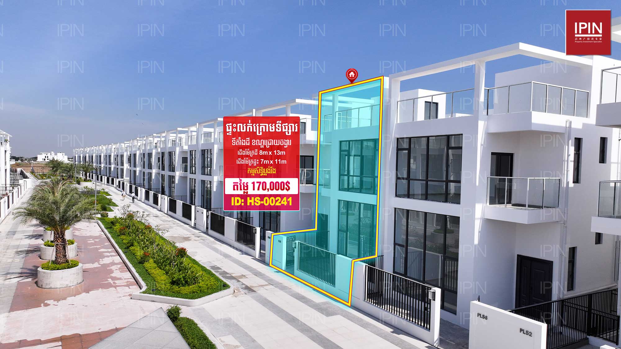 ទំហំដី 8ម៉ែត្រ បណ្តោយ 13ម៉ែត្រ មានទំហំដីសរុប 104ម៉ែត្រការ៉េ និងទំហំផ្ទះទទឹងស្មើនឹង 7ម៉ែត្រ បណ្តោយ 11ម៉ែត្រ ផ្ទះមានកម្ពស់3ជាន់ មានបន្ទប់គេង4 បន្ទប់ទឹក5 បន្ទប់ទទួលភ្ញៀវ1 ចំណតរថយន្តក្រោមដីដាក់ឡានបាន2គ្រឿង បន្ទប់ផ្ទុកឥវ៉ាន់ធំទូលាយ រោងភាពយន្តឯកជន បន្ទប់ហាត់ប្រាណឯកជន វ៉េរង់ដា ស្កាយបា និងមានទីធ្លាផ្ទះធំទូលាយ។