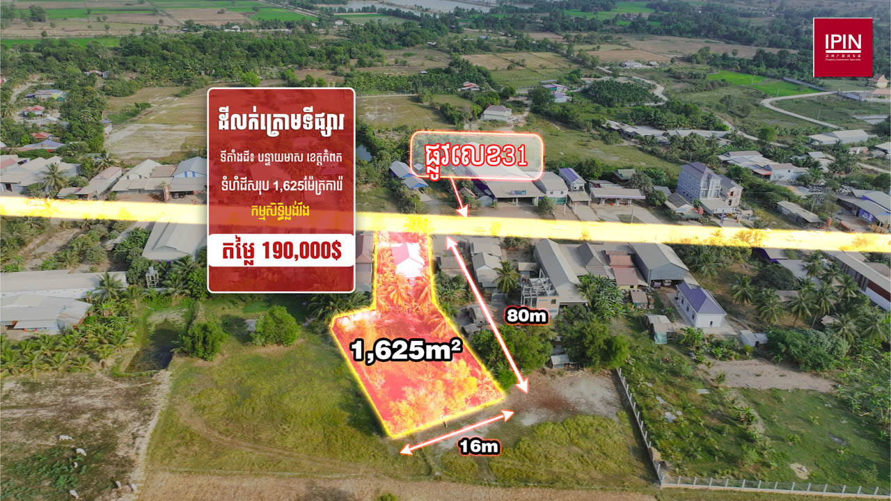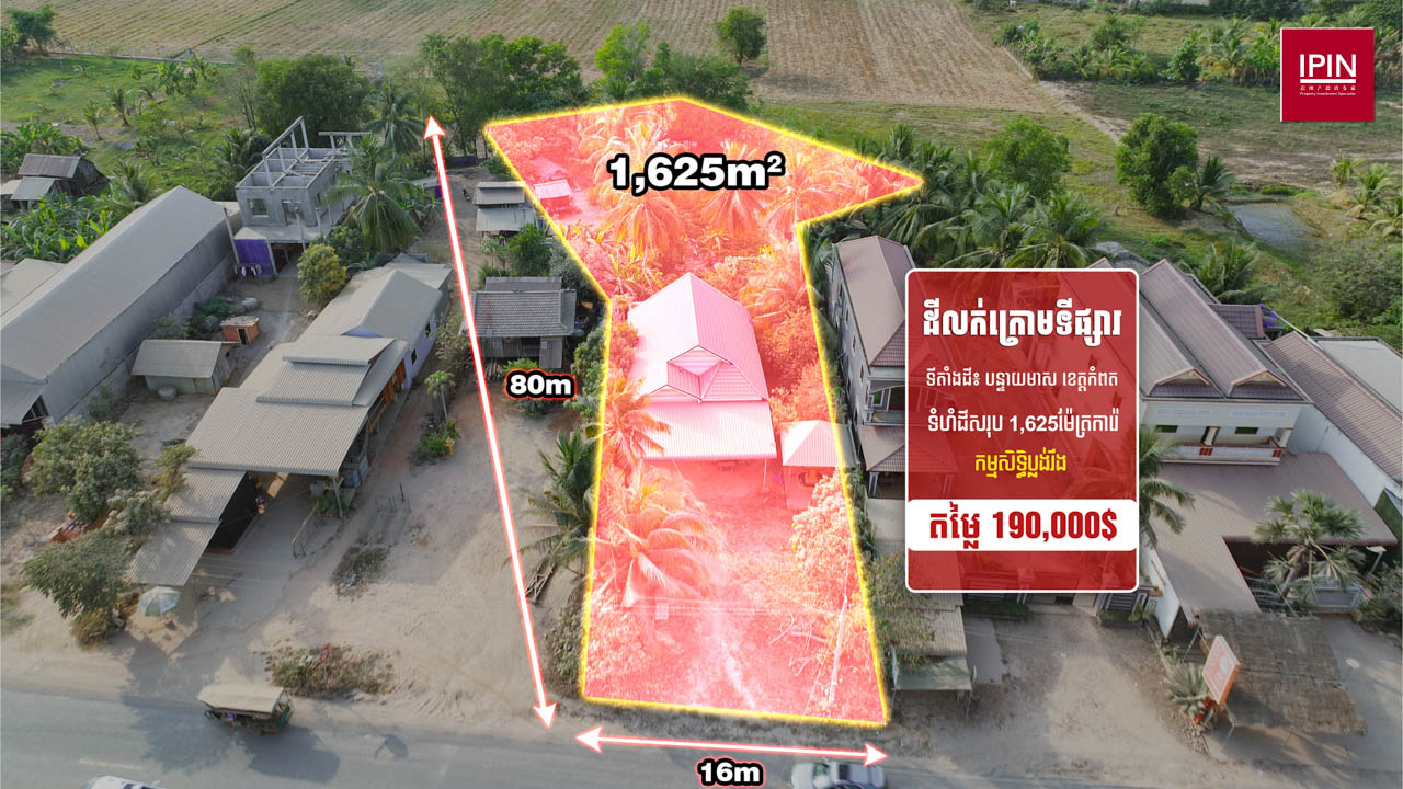 ដីមានទំហំទទឹងស្មើនឹង16m បណ្តោយស្មើនឹង80m និងមានទំហំដីសរុប 1,625m² ចំណែកផ្ទះមានទទឹងស្មើនឹង8m បណ្តោយ15m មានបន្ទប់គេង2 បន្ទប់ទឹក2 មានកម្មសិទ្ធិប្លង់រឹងស្របច្បាប់100%។ ដីជាប់ផ្លូវរដ្ឋ31 ម្ចាស់ត្រូវការលក់បន្ទាន់តម្លៃក្រោមទីផ្សារ ដីទីតាំងស្ថិតនៅភូមិទូកមាស ឃុំទូកមាសខាងលិច ស្រុកបន្ទាយមាស ខេត្តកំពត។ ដី និងផ្ទះមានលក្ខណៈធំទូលាយ និងស្ងប់ស្ងាត់។ ធ្វើដំណើរត្រឹមតែ20នាទី ពីផ្សារកំពង់ត្រាច។