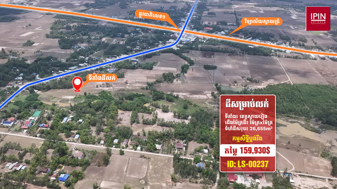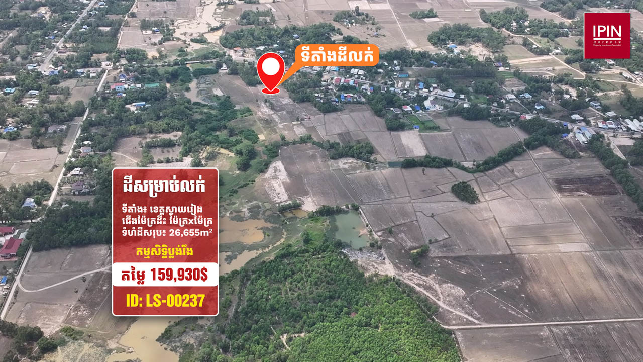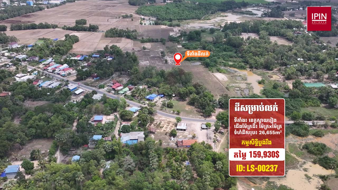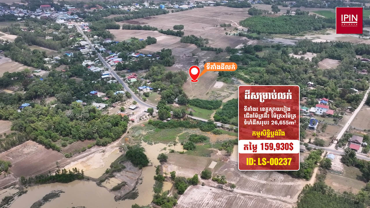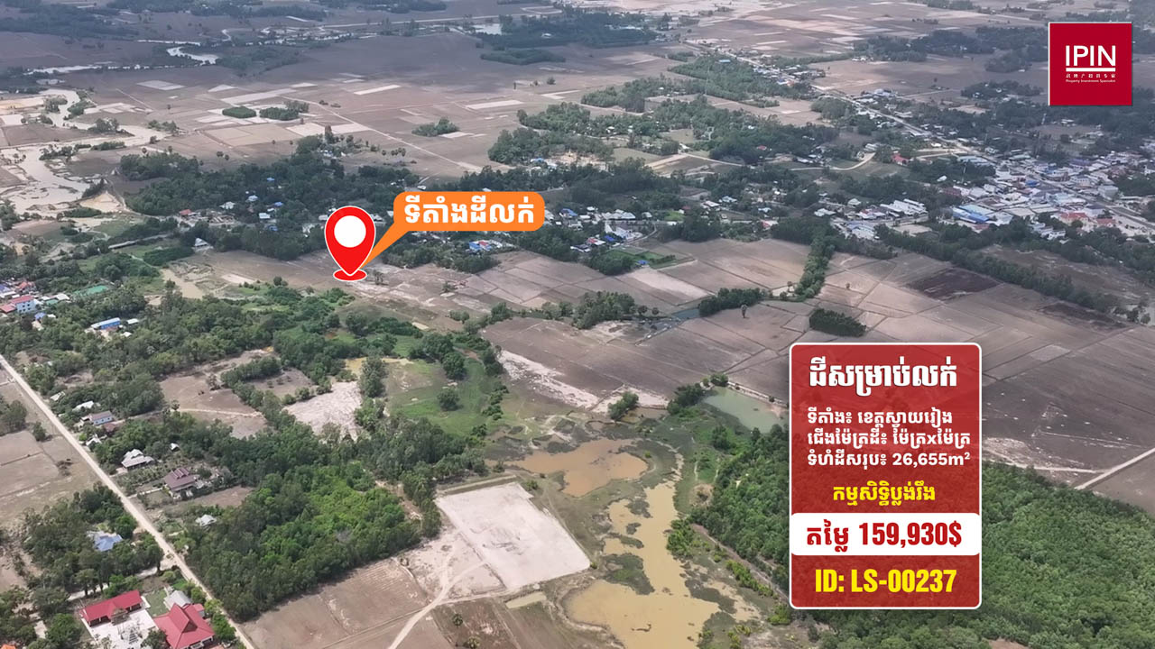 ដីមានទំហំសរុបស្មើនឹង 26,655ម៉ែត្រការ៉េ មានកម្មសិទ្ធិប្លង់រឹង។ ដីមានទីតាំងស្ថិតនៅភូមិតាប៉ ឃុំតាសួស ស្រុកស្វាយជ្រំ ខេត្តស្វាយរៀង។ ដីធំទូលាយក្បែរនឹងផ្លូវរដ្ឋ ធ្វើដំណើរត្រឹមតែ 2នាទី ពីវិទ្យាល័យស្វាយជ្រំ និងផ្លូវជាតិលេខ1 និងធ្វើដំណើរត្រឹមតែ 5នាទី ពីទីខេត្តស្វាយរៀង ដែលមានមនុស្សរស់នៅច្រើនកោះករ នឹងអាចសាងសង់ជាលំនៅដ្ឋាន ប្រកបអាជីវកម្មដូចជា៖ បើកជាហាងការហ្វេ រមណីយដ្ឋាន បើកជាការ៉ាស់សាំង ឬធ្វើជាអ្វីផ្សេងៗ ទៅតាមតម្រូវការរបស់អតិថិជន។
